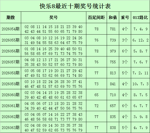 福彩孤高8第2026063期开奖追忆:02 04 08 09 14 30 33 35 37 38 40 47 52 59 62 65 73 75 76 79,其中奖号首尾间距为77,和值为838,012路比为4:7:9,包含8组同尾号码:30-40、02-52-62、33-73、04-14、35-65-75、37-47、08-38、09-59-79,开出5个重号:04、14、38、73、79。