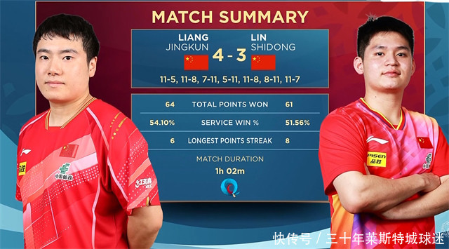 多哈世乒赛男单1/4决赛,梁靖崑4-3投诚林诗栋,晋级男单四强,比分:11-5、11-8、7-11、5-11、11-8、8-11、11-7,纠合四届世乒赛都晋级到男单的半决赛。