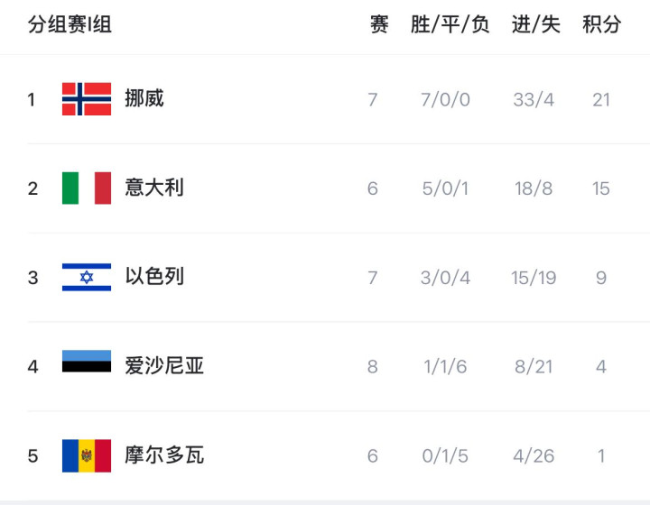 左证规矩,若是意大利在稍后与摩尔多瓦的比赛中无法取胜,那么挪威将提前锁定限额。即便意大利接连打败摩尔多瓦,并在终末一轮平直对话中再胜挪威,使两边积分握平,但由于两队净胜球存在多达19球的深广差距,挪威仍险些不成能被逆转,晋级场面越过融会。