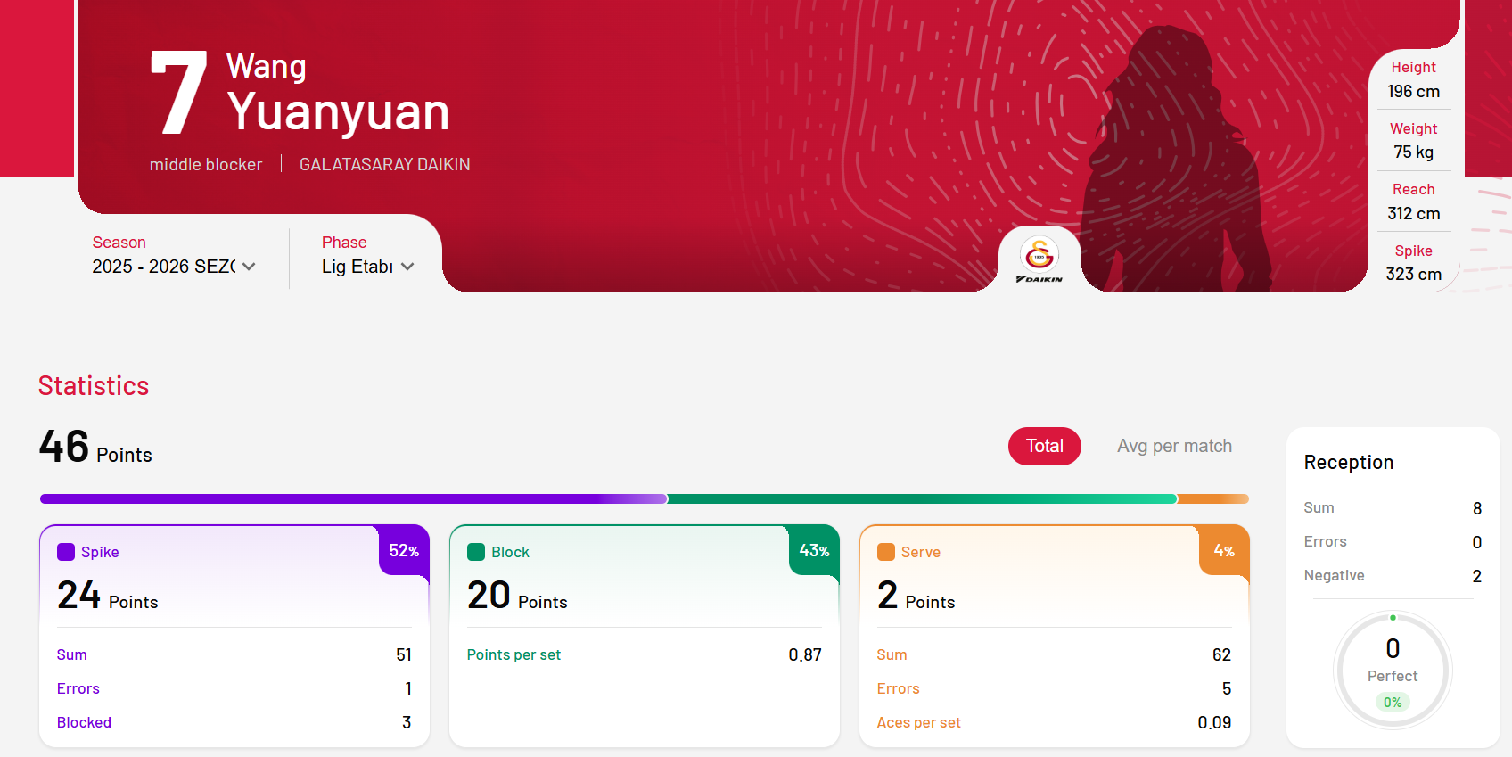 从当今赛季全体数据来看,王媛媛共为加拉塔萨雷女排孝敬46分,其中扣球得分24分(51扣,奏凯率47%),拦网得分投入“20分俱乐部”,发球得分2分,诚然数目未几,但发球造作放手邃密。