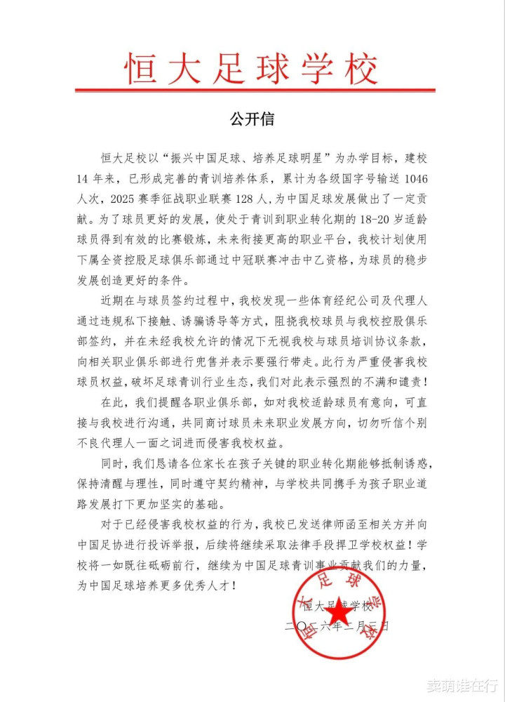 恒大足校此前曾经发出公开信,激烈降低部分牙东说念主违法擅自战斗,摄取诈骗指挥等方法,粗疏足校球员跟足校控股俱乐部签约,向其他劳动俱乐部进行兜销并把孩子强行带走等行动。并强调一经向相关方发出讼师函,并向中国足协提议举报。
