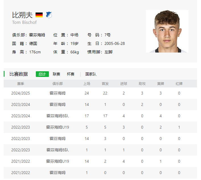 霍芬海姆:比朔夫在霍芬海姆渐渐崭露头角,本赛季圆寂2025年1月,他代表霍芬海姆出场24次,其中22次首发,打进2球况兼送出了3记助攻,当今身价1200万欧元。