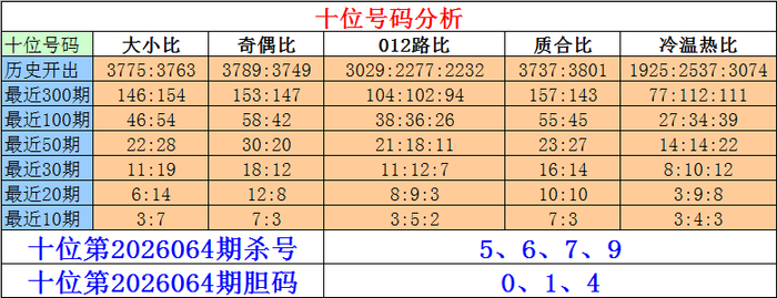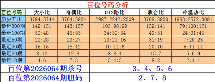 罗列三第2026061期-第2026063期差异开出奖号:347、315、723。 界说:热码:遗漏0-4期;温码:遗漏5-12期;冷码遗漏12期以上。 近期百位大号进展较冷,上期大号出现之后,近期合适缓和大号转热,预测流畅开出;该位偶号近期走冷,当今流畅遗漏4期,本期防偶号解冻。百位本期杀号:3456,胆码缓和:278。 近期十位奇数进展活跃,当今遗漏1期,本期看好再出;该位近期热码出现相对较少,前期开出之后,本期预测热码再次回补。十位杀号:5679,胆码缓和:014。 近期个位质数号码走冷